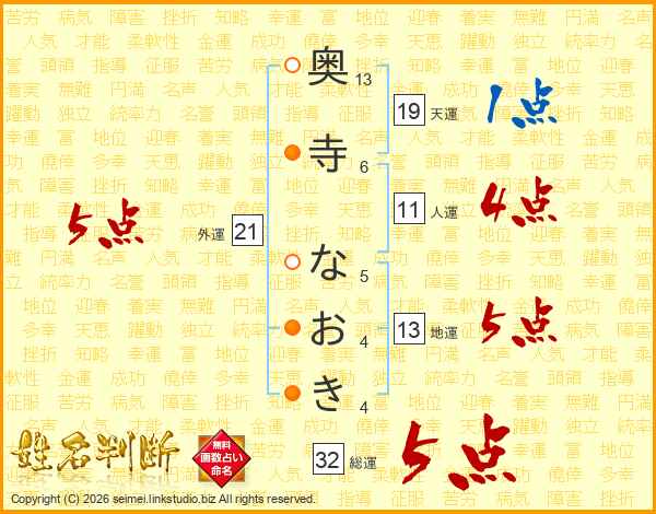 奥(13画)寺(6画) な(5画)お(4画)き(4画)