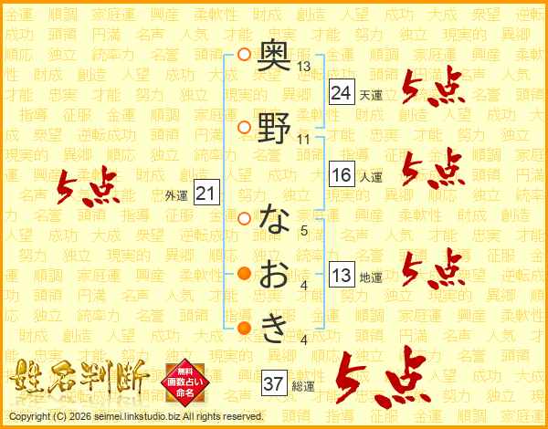 奥野なおきさんの総運は37画の5点!