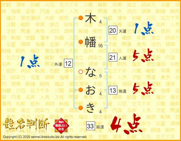 木(4画)幡(16画) な(5画)お(4画)き(4画)
