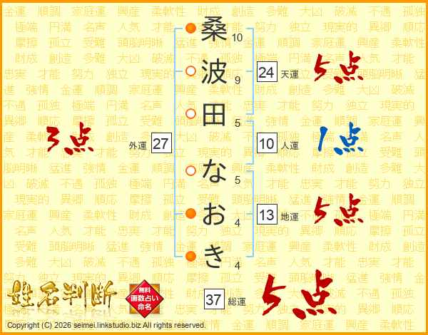 桑(10画)波(9画)田(5画) な(5画)お(4画)き(4画)