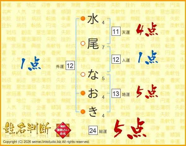 水(4画)尾(7画) な(5画)お(4画)き(4画)