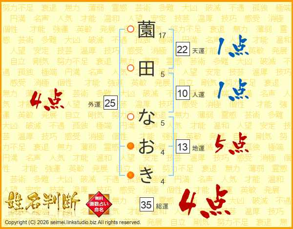 生活面を象徴する運勢です。外部から受ける影響力を表し、結婚運、家庭運や職場、環境への順応性を表します。総運から人運を引いた画数。姓や名が1文字の場合を除く。