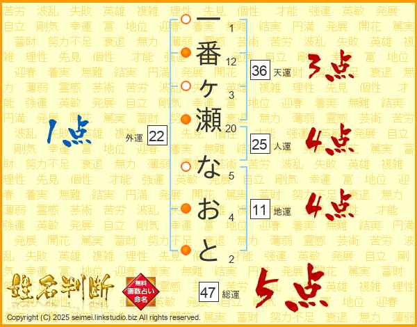 一番ヶ瀬なおとさんの総運は47画の5点!