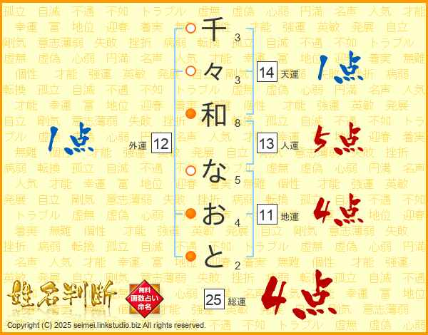 生活面を象徴する運勢です。外部から受ける影響力を表し、結婚運、家庭運や職場、環境への順応性を表します。総運から人運を引いた画数。姓や名が1文字の場合を除く。