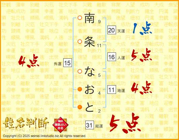 生活面を象徴する運勢です。外部から受ける影響力を表し、結婚運、家庭運や職場、環境への順応性を表します。総運から人運を引いた画数。姓や名が1文字の場合を除く。