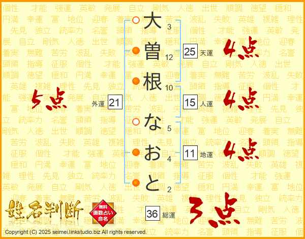 大(3画)曽(12画)根(10画) な(5画)お(4画)と(2画)