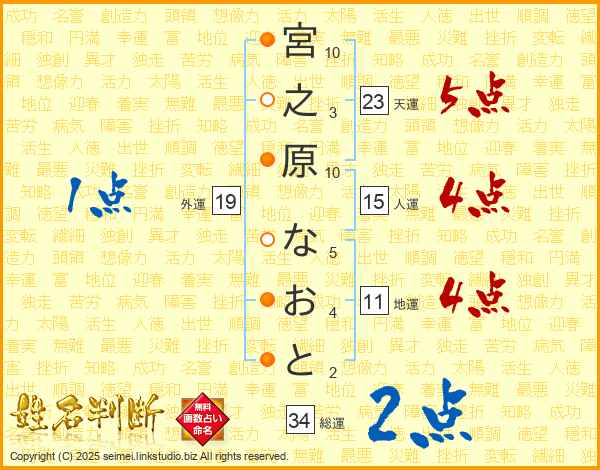 生活面を象徴する運勢です。外部から受ける影響力を表し、結婚運、家庭運や職場、環境への順応性を表します。総運から人運を引いた画数。姓や名が1文字の場合を除く。