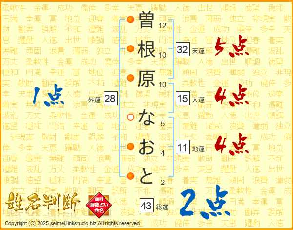 生活面を象徴する運勢です。外部から受ける影響力を表し、結婚運、家庭運や職場、環境への順応性を表します。総運から人運を引いた画数。姓や名が1文字の場合を除く。