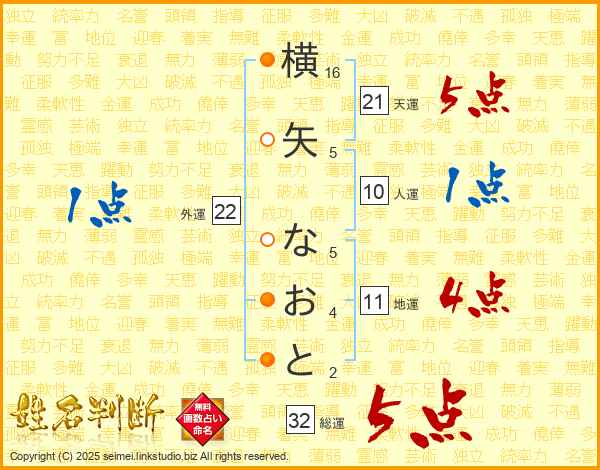 生活面を象徴する運勢です。外部から受ける影響力を表し、結婚運、家庭運や職場、環境への順応性を表します。総運から人運を引いた画数。姓や名が1文字の場合を除く。
