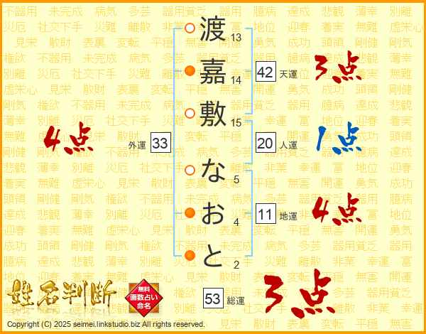 渡(13画)嘉(14画)敷(15画) な(5画)お(4画)と(2画)