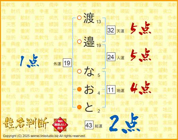 生活面を象徴する運勢です。外部から受ける影響力を表し、結婚運、家庭運や職場、環境への順応性を表します。総運から人運を引いた画数。姓や名が1文字の場合を除く。