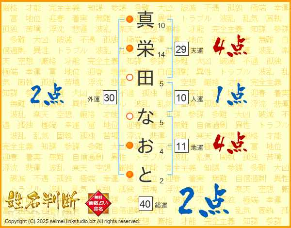 真(10画)栄(14画)田(5画) な(5画)お(4画)と(2画)