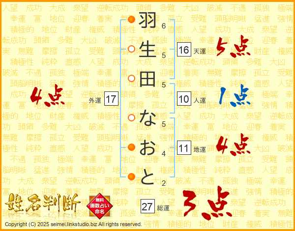 羽(6画)生(5画)田(5画) な(5画)お(4画)と(2画)