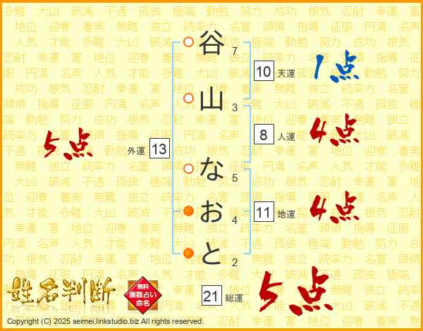 谷(7画)山(3画) な(5画)お(4画)と(2画)