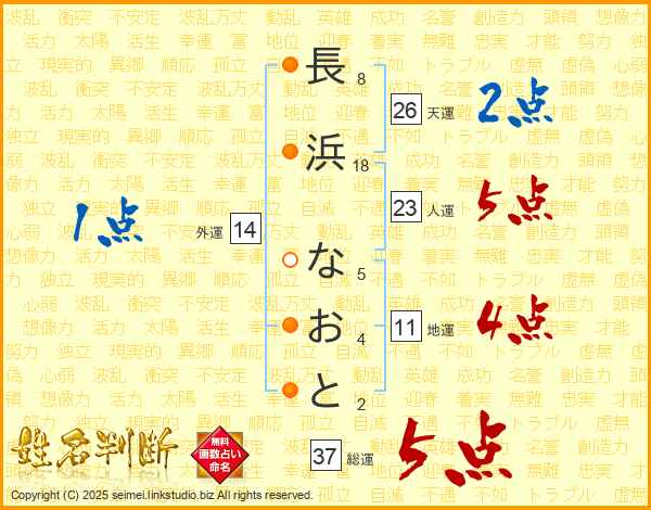 あなたの人生を表す1番重要な運勢です。生涯を通じて影響する総合運となり、主に50歳以降の晩年期に影響を及ぼします。苗字と名前の合計画数。