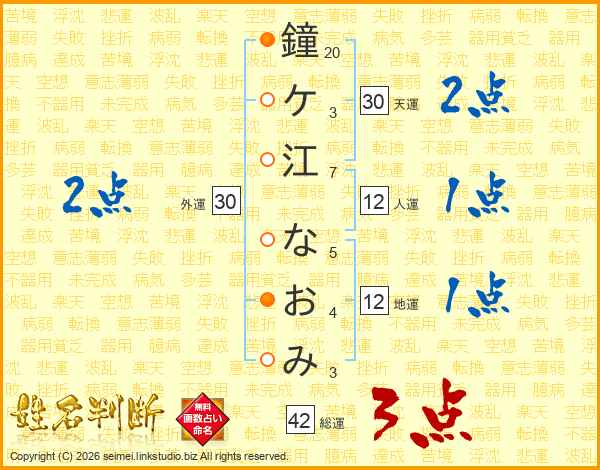 鐘(20画)ケ(3画)江(7画) な(5画)お(4画)み(3画)