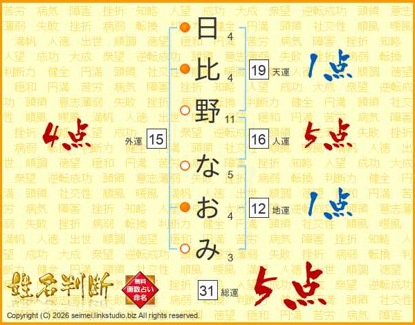 日(4画)比(4画)野(11画) な(5画)お(4画)み(3画)