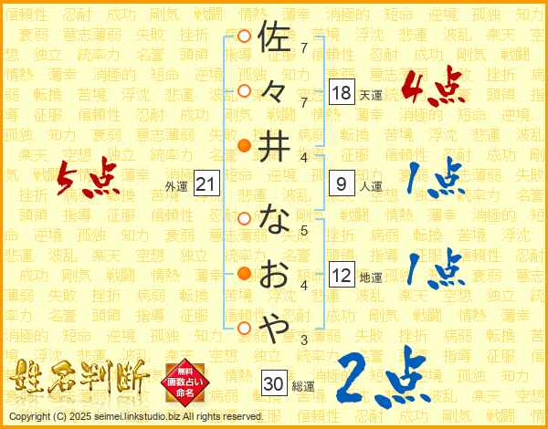 佐(7画)々(7画)井(4画) な(5画)お(4画)や(3画)