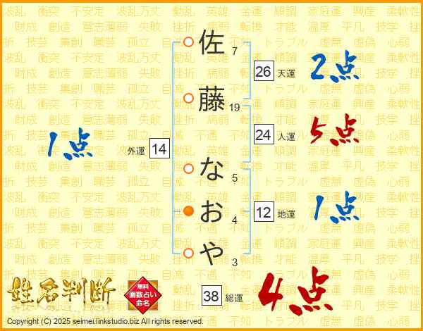 佐(7画)藤(19画) な(5画)お(4画)や(3画)