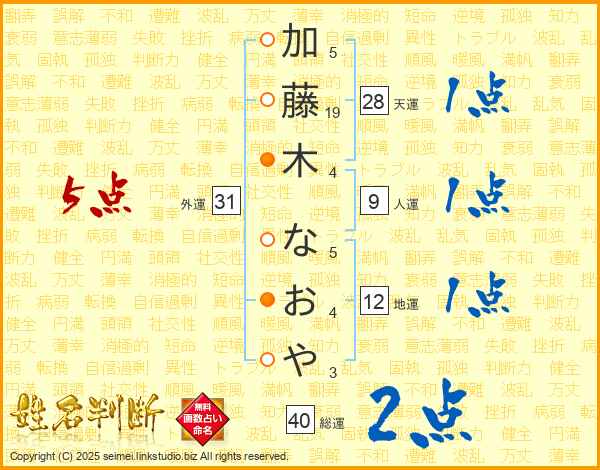 加(5画)藤(19画)木(4画) な(5画)お(4画)や(3画)