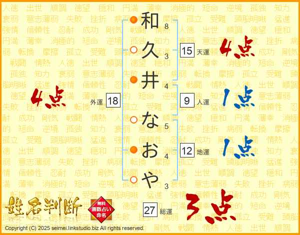 生活面を象徴する運勢です。外部から受ける影響力を表し、結婚運、家庭運や職場、環境への順応性を表します。総運から人運を引いた画数。姓や名が1文字の場合を除く。