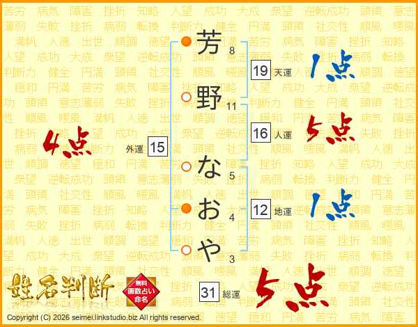 芳(8画)野(11画) な(5画)お(4画)や(3画)