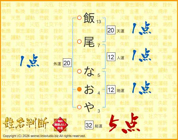 飯(13画)尾(7画) な(5画)お(4画)や(3画)