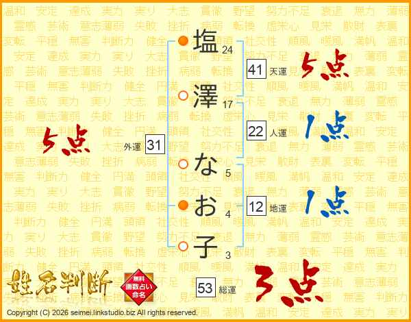 塩(24画)澤(17画) な(5画)お(4画)子(3画)