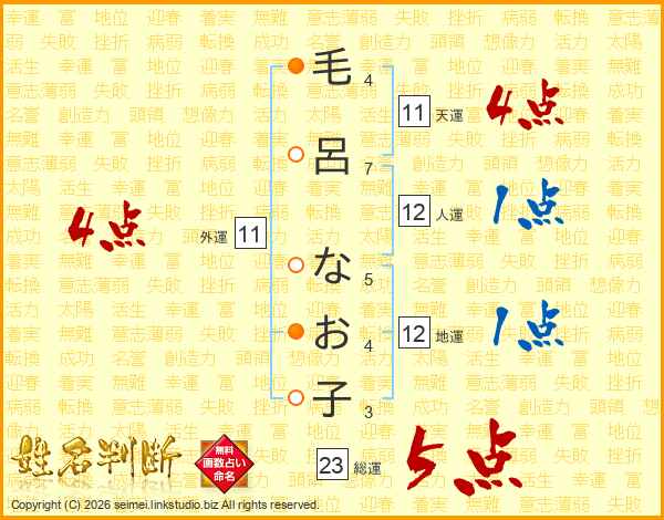 毛(4画)呂(7画) な(5画)お(4画)子(3画)