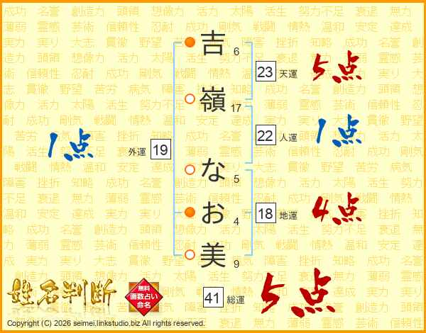 吉(6画)嶺(17画) な(5画)お(4画)美(9画)