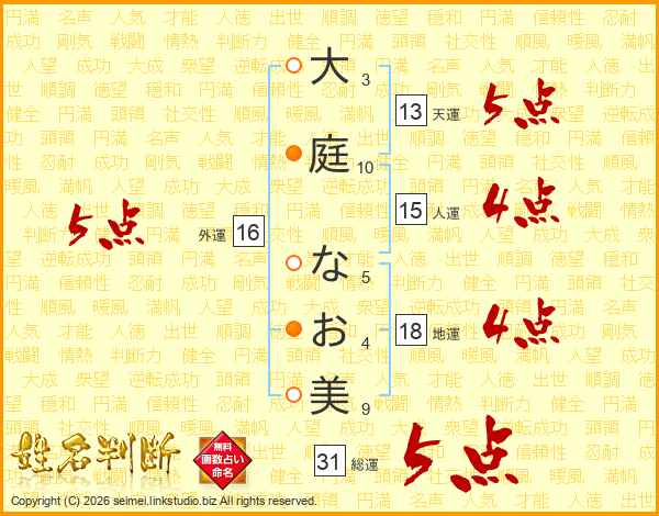 大(3画)庭(10画) な(5画)お(4画)美(9画)