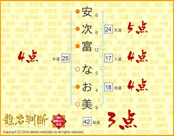 安(6画)次(6画)富(12画) な(5画)お(4画)美(9画)