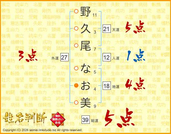野(11画)久(3画)尾(7画) な(5画)お(4画)美(9画)