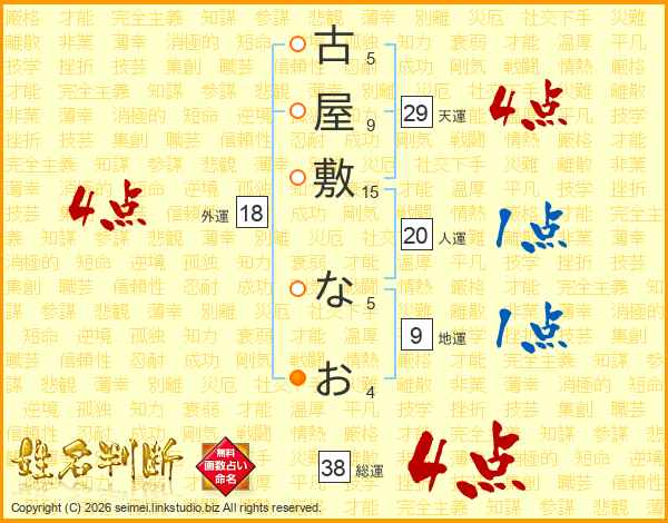古(5画)屋(9画)敷(15画) な(5画)お(4画)