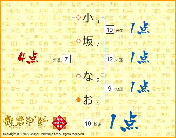 生活面を象徴する運勢です。外部から受ける影響力を表し、結婚運、家庭運や職場、環境への順応性を表します。総運から人運を引いた画数。姓や名が1文字の場合を除く。