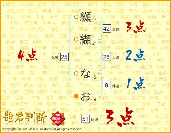 生活面を象徴する運勢です。外部から受ける影響力を表し、結婚運、家庭運や職場、環境への順応性を表します。総運から人運を引いた画数。姓や名が1文字の場合を除く。
