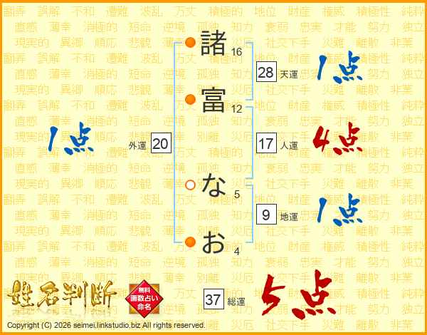 生活面を象徴する運勢です。外部から受ける影響力を表し、結婚運、家庭運や職場、環境への順応性を表します。総運から人運を引いた画数。姓や名が1文字の場合を除く。