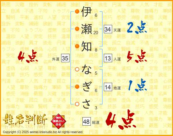 伊(6画)瀬(20画)知(8画) な(5画)ぎ(6画)さ(3画)