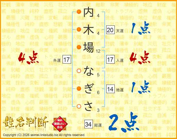 内(4画)木(4画)場(12画) な(5画)ぎ(6画)さ(3画)