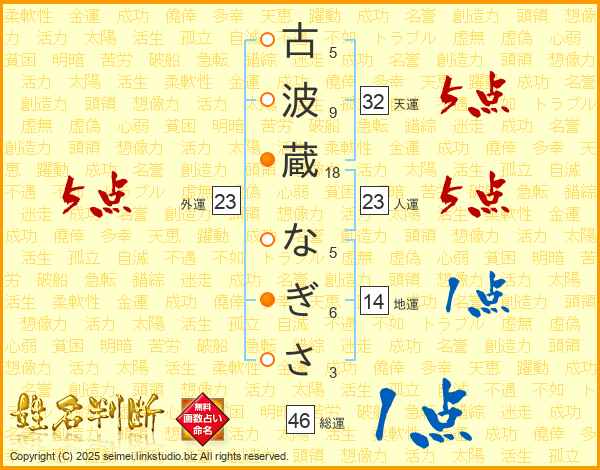古(5画)波(9画)蔵(18画) な(5画)ぎ(6画)さ(3画)