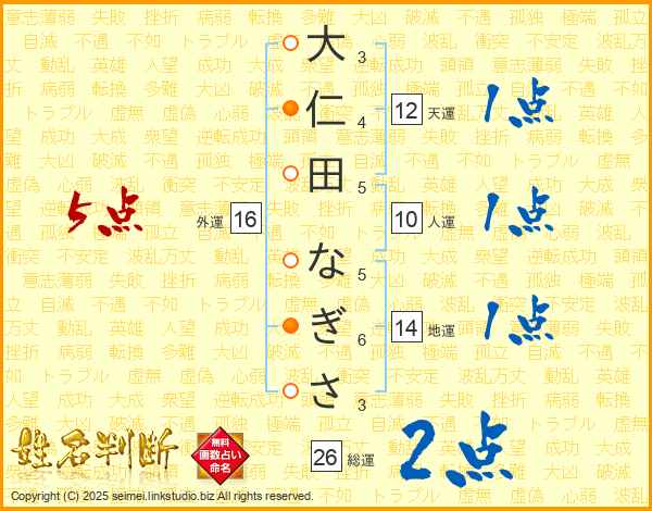 大(3画)仁(4画)田(5画) な(5画)ぎ(6画)さ(3画)