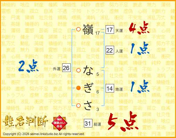 生活面を象徴する運勢です。外部から受ける影響力を表し、結婚運、家庭運や職場、環境への順応性を表します。総運から人運を引いた画数。姓や名が1文字の場合を除く。