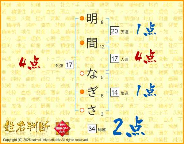 生活面を象徴する運勢です。外部から受ける影響力を表し、結婚運、家庭運や職場、環境への順応性を表します。総運から人運を引いた画数。姓や名が1文字の場合を除く。