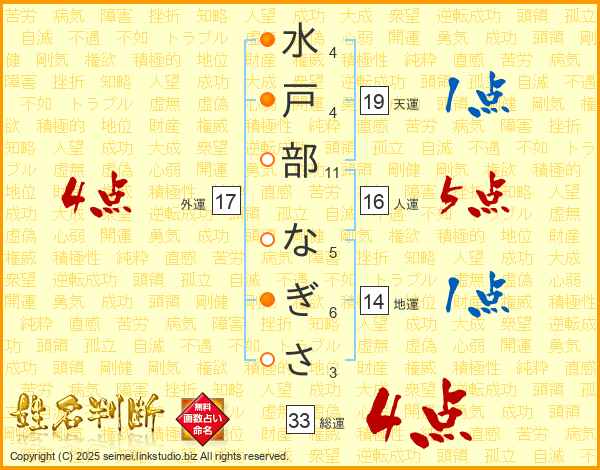 生活面を象徴する運勢です。外部から受ける影響力を表し、結婚運、家庭運や職場、環境への順応性を表します。総運から人運を引いた画数。姓や名が1文字の場合を除く。