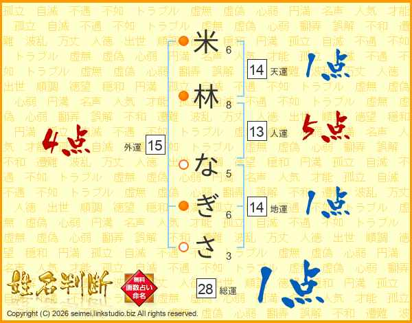 米(6画)林(8画) な(5画)ぎ(6画)さ(3画)