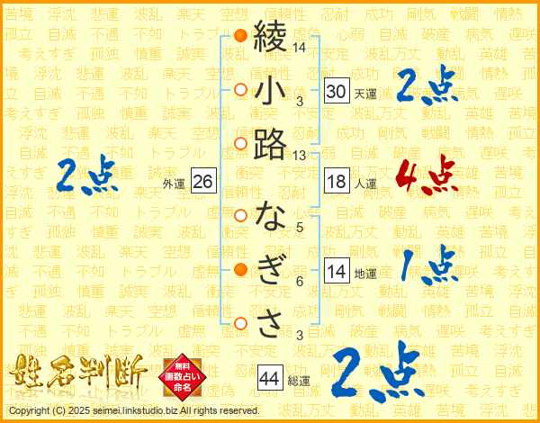生活面を象徴する運勢です。外部から受ける影響力を表し、結婚運、家庭運や職場、環境への順応性を表します。総運から人運を引いた画数。姓や名が1文字の場合を除く。