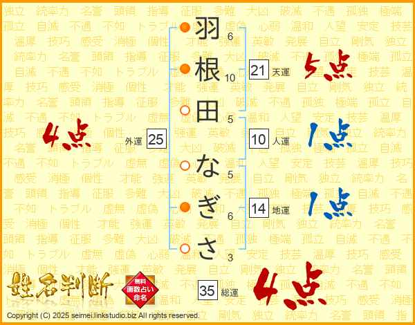 羽(6画)根(10画)田(5画) な(5画)ぎ(6画)さ(3画)