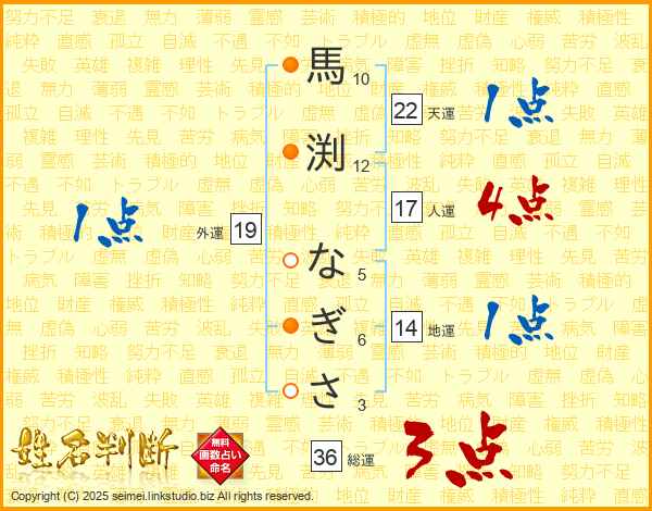 生活面を象徴する運勢です。外部から受ける影響力を表し、結婚運、家庭運や職場、環境への順応性を表します。総運から人運を引いた画数。姓や名が1文字の場合を除く。