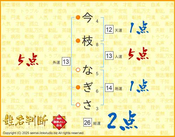 今(4画)枝(8画) な(5画)ぎ(6画)さ(3画)