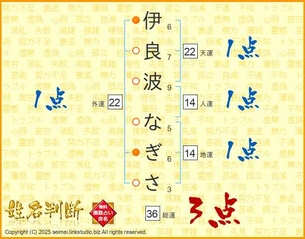 伊(6画)良(7画)波(9画) な(5画)ぎ(6画)さ(3画)